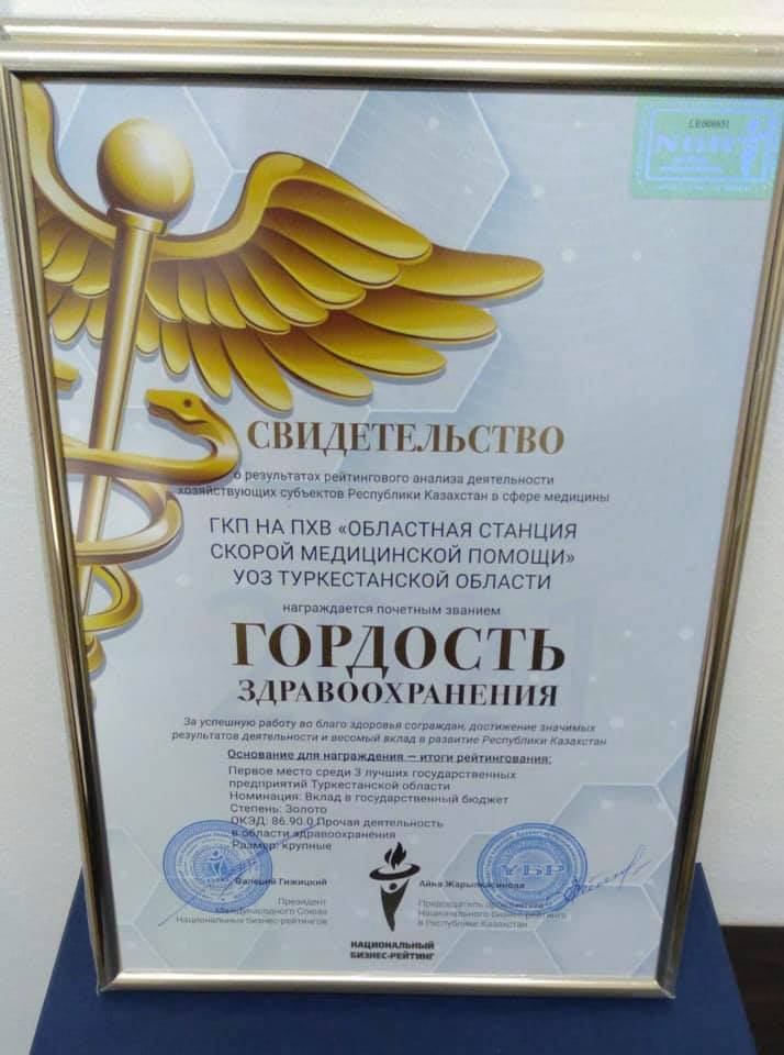 Түркістан облыстық жедел медициналық жәрдем станциясы Қазақстан Республикасындағы Ұлттық бизнес-рейтинг Халықаралық кеңесінің шешімімен Түркістан облысындағы медицина саласында қызмет көрсетіп жатқан ең үздік 3 медициналық ұйымдар арасында 1-ші орынды иеленді!