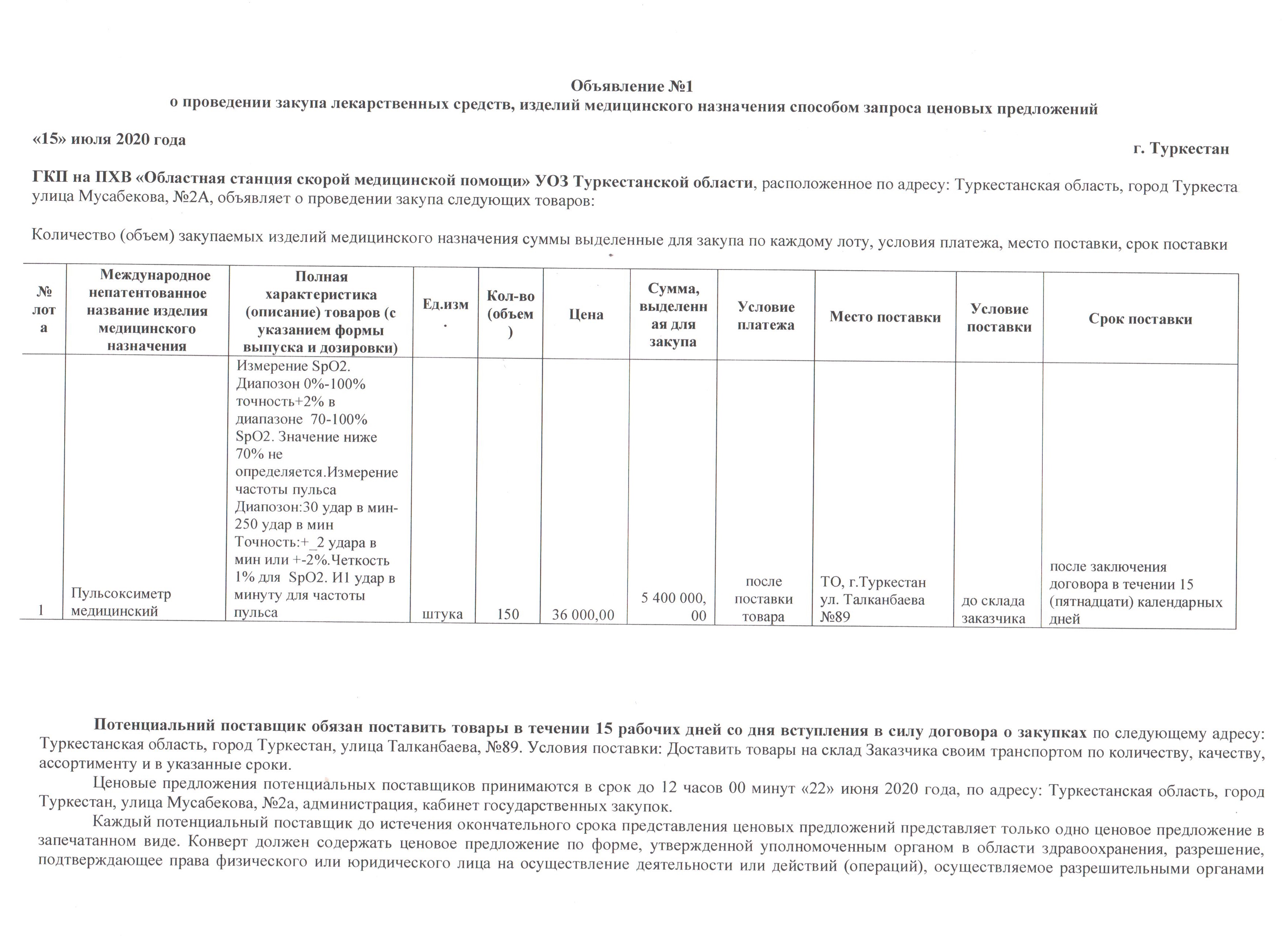Государственное коммунальное предприятие на праве хозяйственного ведения "Областная станция скорой медицинской помощи" управления общественного здоровья Туркестанской области